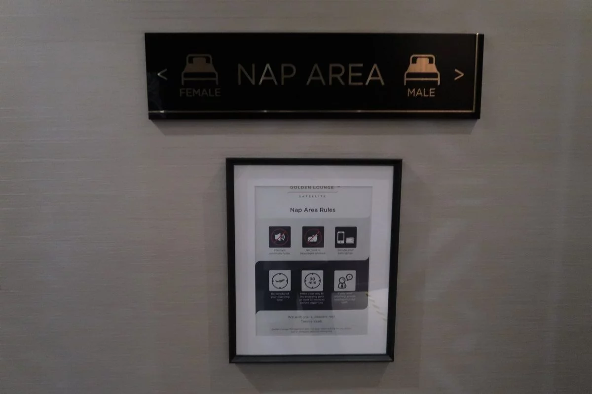 The Lounge contains a quieter family space, prayer room and nap room with partitioned nap beds which could be a lifesaver in a flight delay situation.